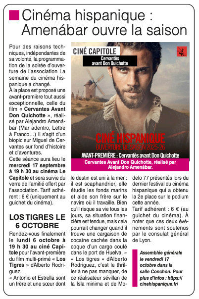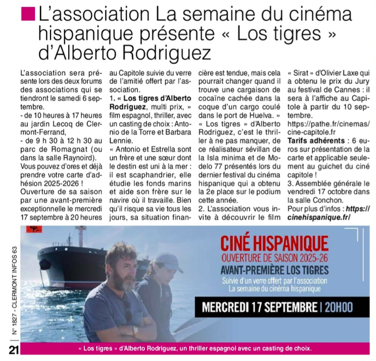 Clermont Infos 63 n°1827 : L’association Ciné Hispanique présente « Los Tigres » (film annulé et remplacé par un autre, voir nouvel article dans n°1828 ci-dessus)